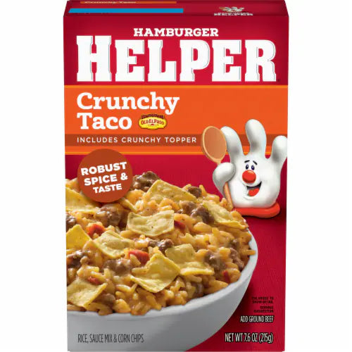 Spice up your dinner routine with Hamburger Helper Crunchy Taco! This Tex-Mex-inspired meal kit delivers the bold flavor of tacos in a hearty, one-skillet dish. Featuring shell pasta in a zesty taco-seasoned sauce, it's made to pair perfectly with ground beef—and topped off with a satisfying crunch from included tortilla chips.