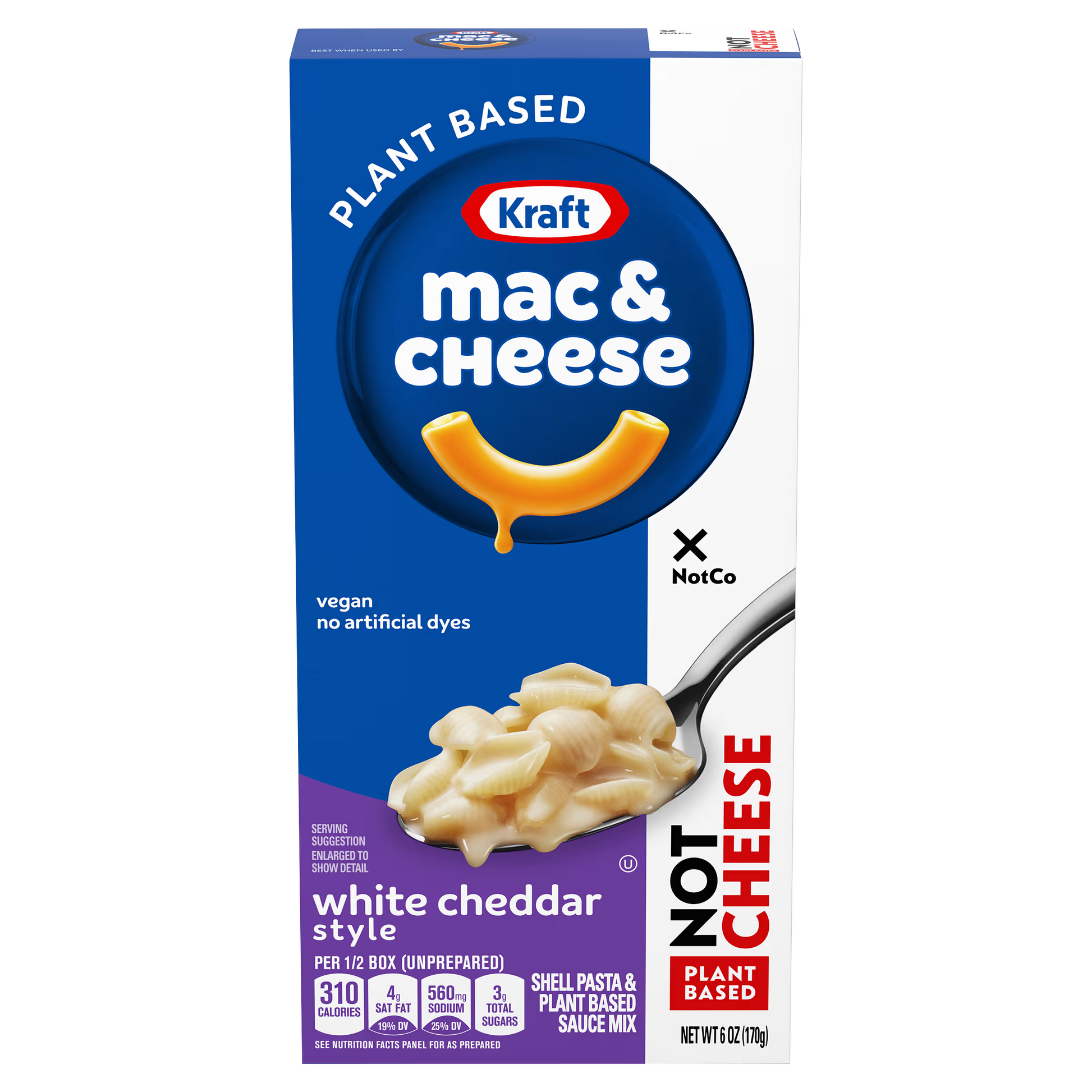 Cheesy, creamy, and 100% plant-based. Kraft Not Mac & Cheese – White Cheddar Flavor gives you that rich, tangy white cheddar taste you crave—without any dairy. Made with a blend of fava bean protein and coconut oil powder, this vegan version of the comfort food classic is just as satisfying as the original, with a bold white cheddar twist.